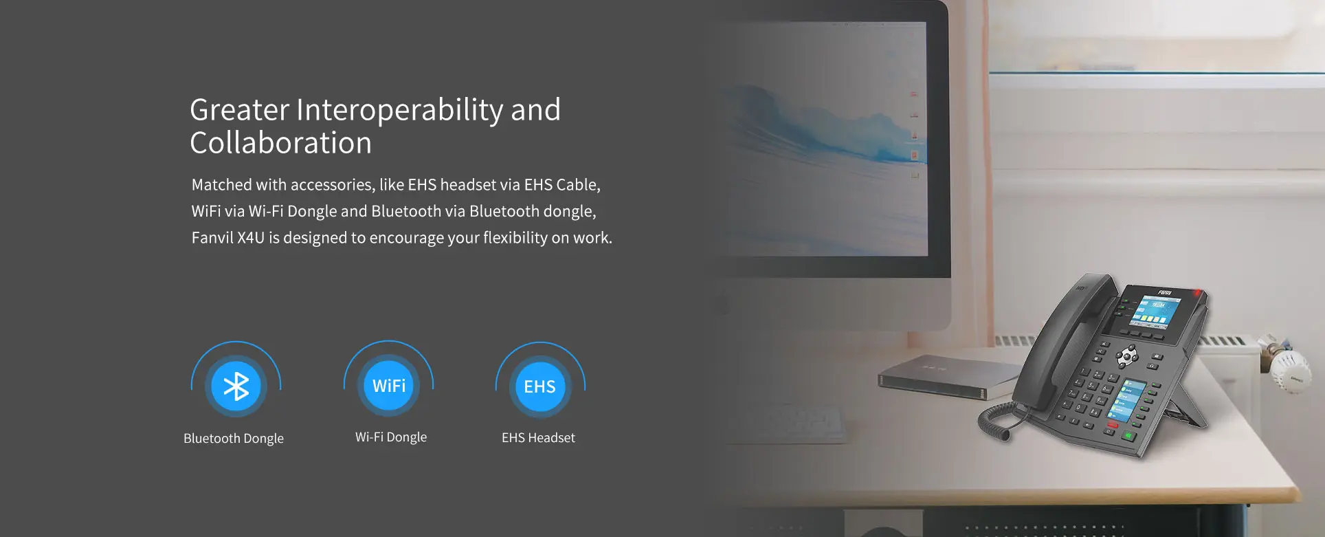Mang đến sự linh hoạt trong công việc cho người sử dụng với tính năng kết nối với các thiết bị và phụ kiện khác, người dùng có thể kết nối tai nghe call center qua cáp EHS , qua WiFi dongle và Bluetooth qua Bluetooth dongle..